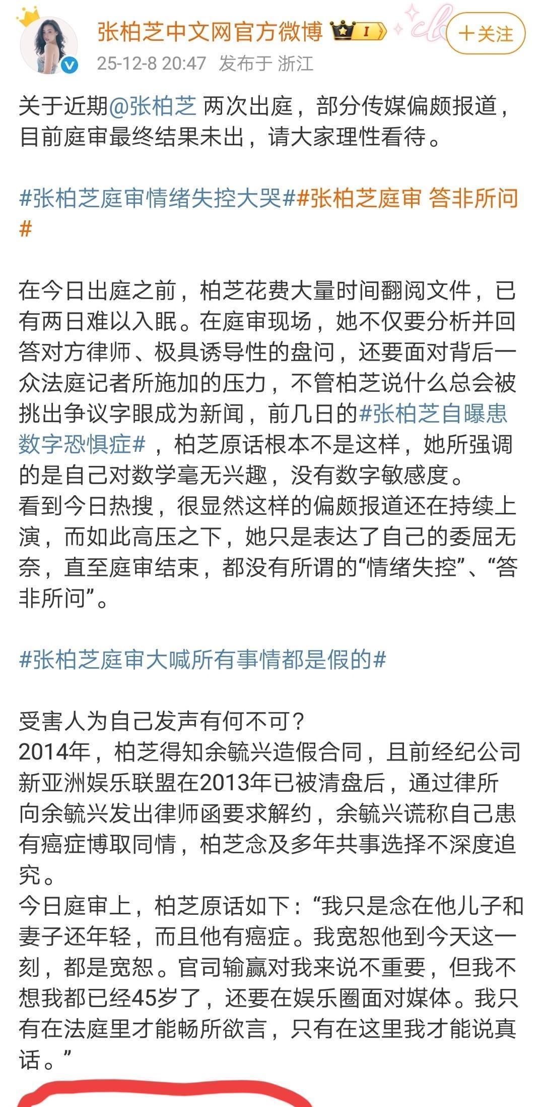 对于张柏芝这一次官司风波,其官方粉丝团也发文做了回应。首先,官方粉丝团认为,部分传媒存在偏颇报道。例如患数字恐惧症这一话题,张柏芝的原话并非这样,她强调的是自己对数学毫无兴趣,没有数字敏感度。另外,张柏芝也没有情绪失控、答非所问的表现,她只是表达自己的委屈而已。还有一点,张柏芝控诉余毓兴谎称自己有癌症博取她的同情,所以2013年才没有深度追究其责任,对他一直宽恕。最后,官方粉丝团用了十个字来点评,为何张柏芝会走到今天这样的局面,这十个字是“今日留一线,日后必中箭”。大概意思是因为张柏芝太善良,当初没有把事情做绝,留了一线,才导致今天中了对方射来的报复之箭。