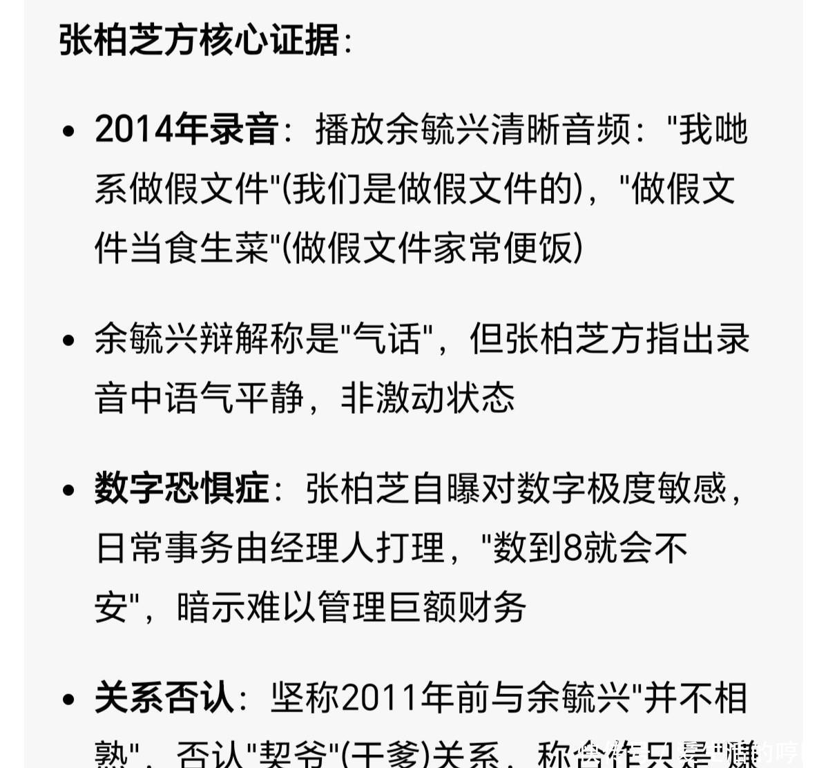 张柏芝方的核心证据有一份2014年的录音,并且张柏芝否认了与余毓兴的干爹关系,称与他不是太熟。